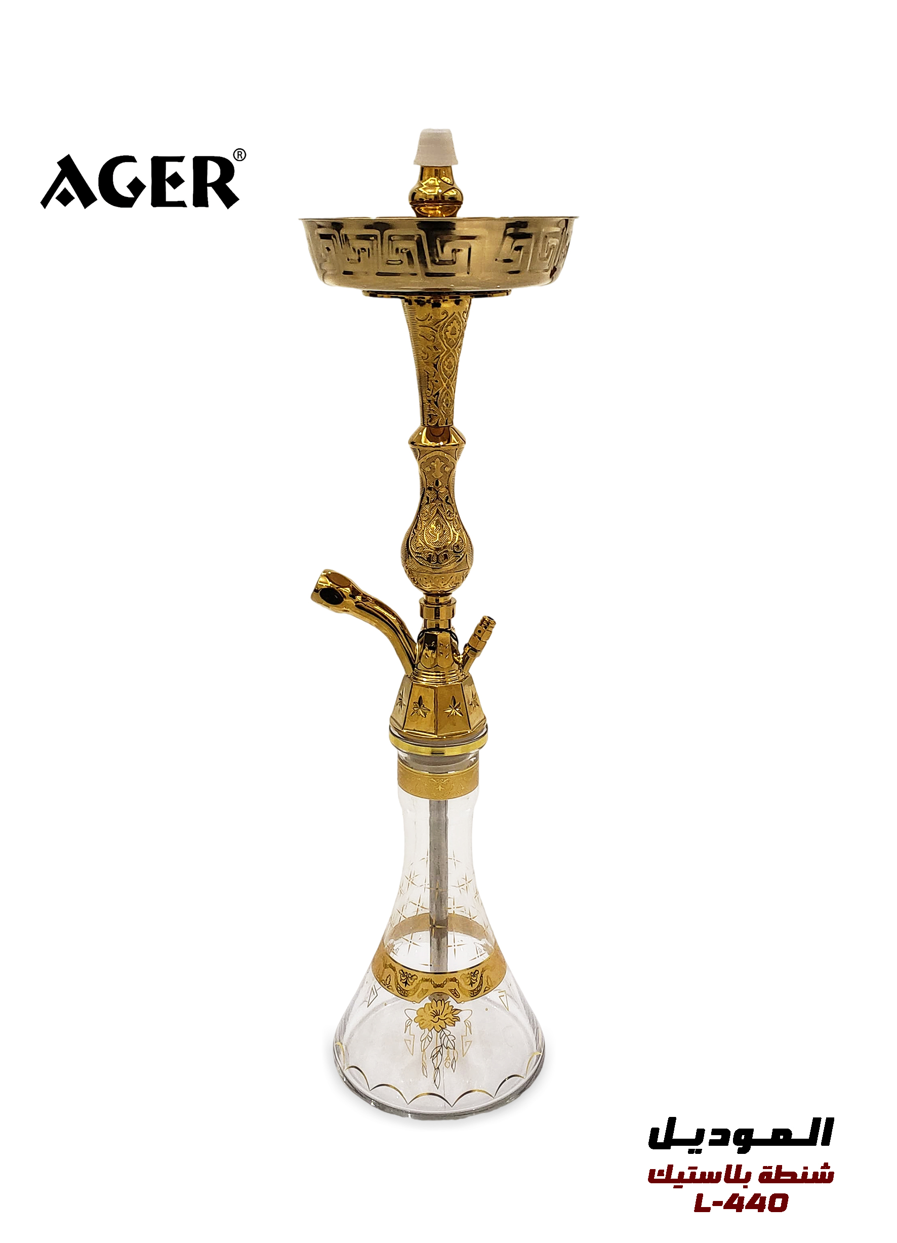 يجمع AGER L-440 Hookah بين الأناقة التقليدية واللمسة الذهبية الفاخرة مع نقوش دقيقة. تأتي قاعدته الزجاجية المتينة مزينة بزخارف نباتية، لتوفر ثباتًا وجاذبية بصرية في آن واحد. خيار مثالي لعشاق الشيشة الكلاسيكية الباحثين عن الأداء والتصميم الخالد.