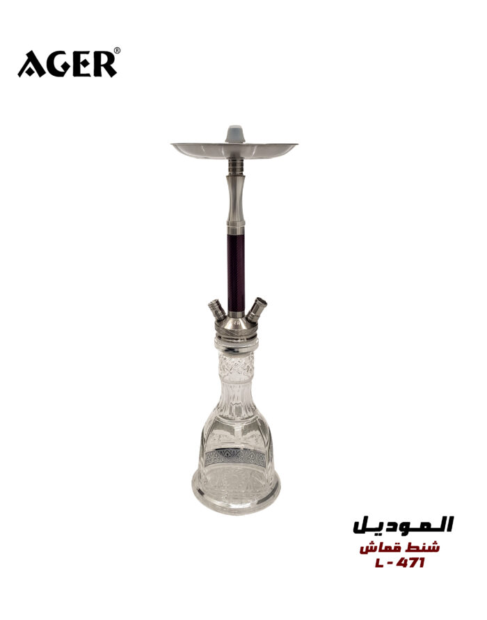 The AGER L-471 model is a perfect blend of sophistication and function, featuring a sleek metal stem with a deep maroon accent and a finely etched crystal-clear glass base. Designed for both aesthetics and durability, it comes with a premium fabric bag for easy portability — ideal for modern hookah lovers who seek both style and performance.